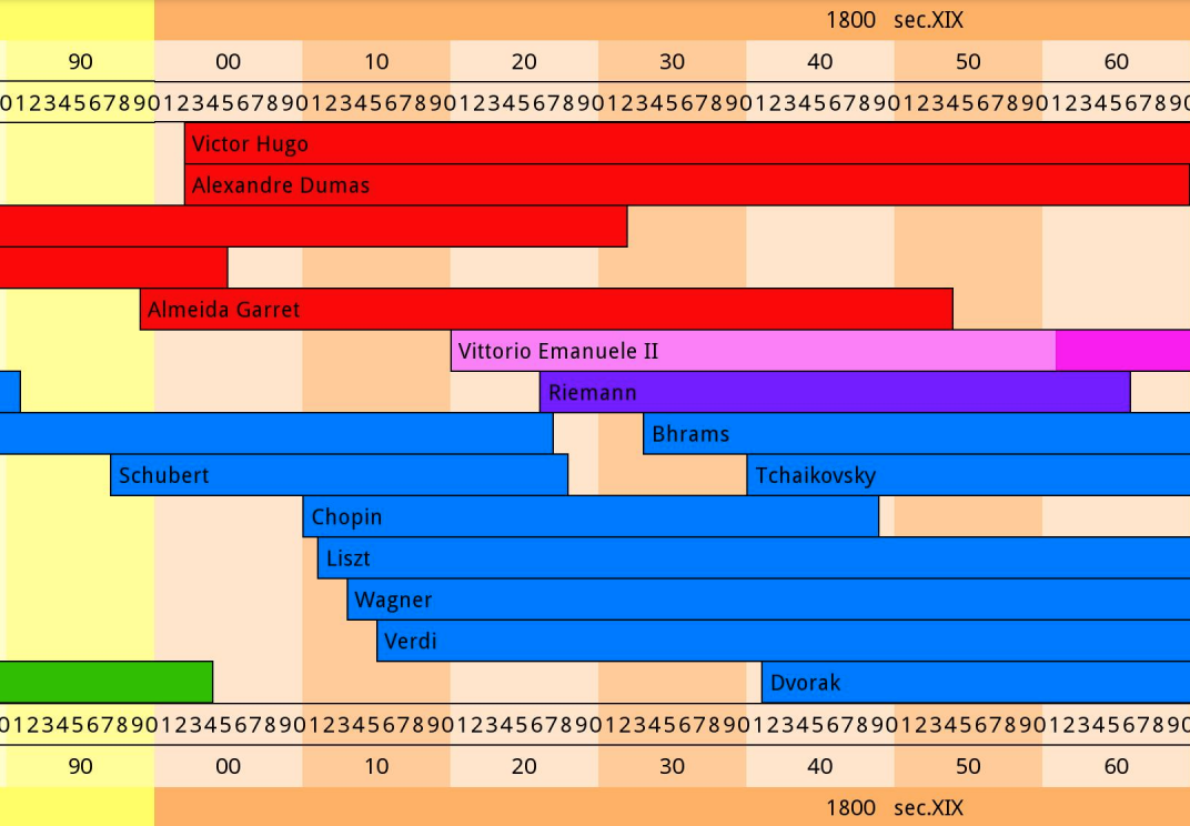 My first project in Python. In fact, I earned Python with and for this project. I wanted a program to generate timelines to visually contextualize the lifespans of historical personalities and events. Back then, I was deep into 19th century music and literature. Independently I had knowledge about this period, but lacked integration between fields and even between nationalities. We tend to study the history of countries separately, which inhibits our ability to understand the influence of the underlying arts and thought movements and schools. The project was built from scratch on python 3 and SQL Alchemy for database. I was positively surprised when I painlessly managed to revive such old code in 2022 to make a French Revolution timeline to help contextualize a podcast on the topic.