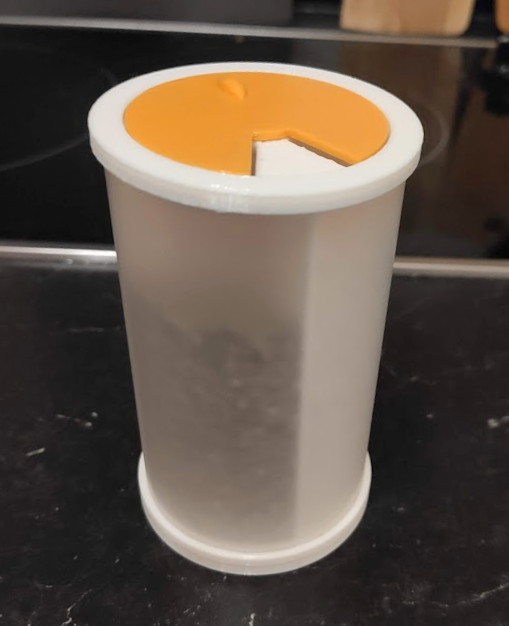 I could not find the kitchen solution I was looking for -- to have my most used spices in the same jar. I decided to make it myself using 3D printed food grade PET and an acrylic tube.